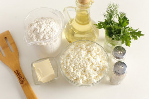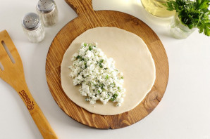 Соедините творог, зелень, соль и молотый перец по вкусу. Хорошо перемешайте. Начинка готова.