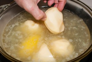 У розігрітий бульйон опускаємо цілі очищені картоплини.