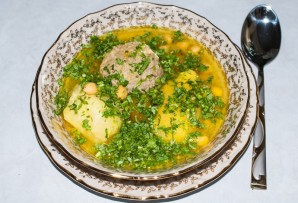 Готовий суп подають так: в миску кладуть тефтель, цілий картоплю, аличу, нут, заливають бульйоном. Можна прикрасити свіжою зеленню і подавати до столу.