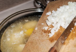 Цибулю очищаємо і нарізаємо невеликими кубиками, додаємо її в бульйон до картоплі. Ставимо варитися на середньому вогні.