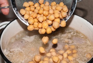 Потім викладаємо в каструлю вже готовий нут, його слід замочити на ніч, а вранці злити воду, залити новою і варити 1,5 години.