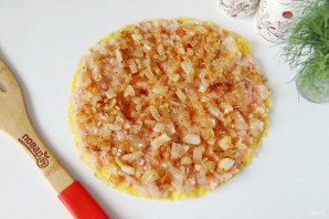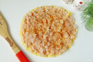 Покладіть на рівну поверхню один млинчик. Зверху рівномірно тонким шаром розподіліть фарш. Посипте фарш сіллю та улюбленими спеціями за смаком.