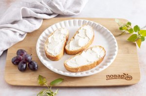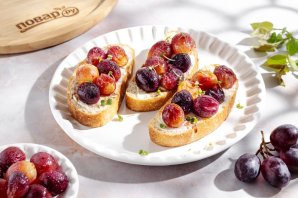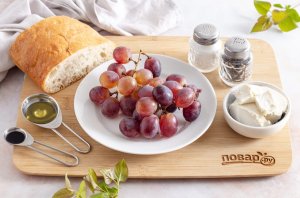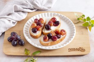 Перед подачей добавьте бальзамический уксус по вкусу. Брускетта с печеным виноградом готова, приятного вам аппетита!