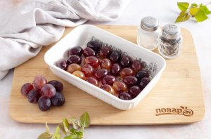 Отделите ягоды винограда от веточек. Смажьте ягоды оливковым маслом, посолите и поперчите. Запекайте 12-15 минут в разогретой до 220 градусов духовке. Виноград должен пустить сок и лопнуть.