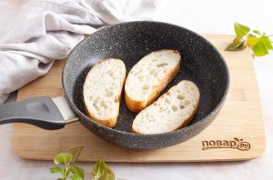 Чиабатту разрежьте на ломтики среднего размера и обжарьте с двух сторон на сухой сковороде до легкого золотистого цвета.