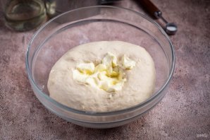 Замесите тесто и добавьте к нему мягкое сливочное масло, соль. Вмешайте его в тесто и продолжайте замес руками. Я вымешивала примерно 10 минут. По ходу процесса немного добавляйте муки, если необходимо, но не забивайте тесто мукой.