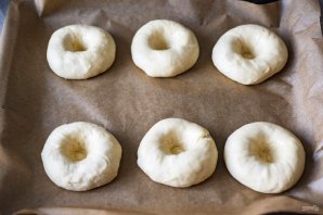 Противень застелите пергаментом для выпекания, выложите шарики теста на достаточно большом расстоянии друг от друга. У меня на стандартном противне поместилось 6 штук. Донышком стакана продавите в каждой заготовке выемку. Можно смазать эти заготовки с выемками взболтанным яйцом с помощью кулинарной кисти.