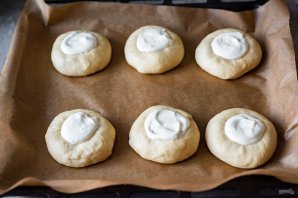 Сметанной начинкой аккуратно заполните выемки в заготовках будущих булочек. Отправьте булочки выпекаться в уже разогретую до 180 градусов духовку на 30-35 минут.