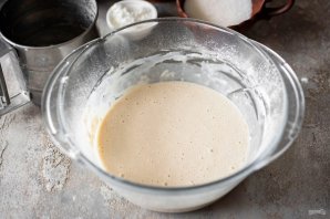 Венчиком перемешайте все до полного исчезновения комочков — это опара. Миску с опарой накройте кухонным полотенцем и оставьте в покое на 30 минут.