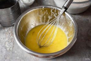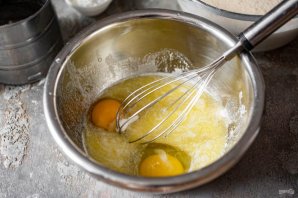 В отдельную миску залейте сливочное масло, растопленное в сотейнике на маленьком огне и уже охлажденное, вбейте яйца и добавьте оставшуюся часть сахара.