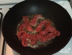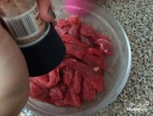 Говяжье филе нарезаем тонкими полосками. Можно замариновать в соевом соусе, а можно посолить и добавить пару капель соуса табаско. Перемешайте и пусть постоит минут 30.