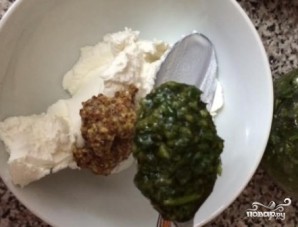 Приготовим соус. Для этого смешаем сметану, горчицу и соус сальса-верде.