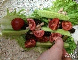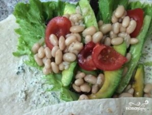 Добавляем консервированную фасоль и заворачиваем. Сначала подвернем нижний край лепешки, чтобы начинка не выпадала, а затем заворачиваем боковые края лепешки.