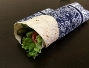 Для бурито берем кукурузную или пшеничную лепешку, а за неимением таковой можно взять тонкий лаваш. Смазываем тортилью соусом и выкладываем на нее листья салата, мясо, нарезанные помидор и огурец. Корнишоны можно оставить целыми.