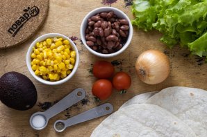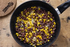 Добавьте промытую фасоль и кукурузу. Посолите и поперчите по вкусу. Обжаривайте пару минут все вместе.
