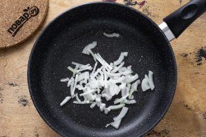 Репчатый лук нарежьте тонкими полукольцами. Обжарьте в сковороде до мягкости.