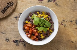 Переложите начинку в тарелку. Добавьте нарезанный кубиками авокадо и помидоры черри.