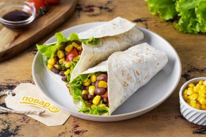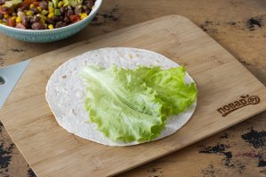 Лепешку подогрейте на сухой сковороде с двух сторон. Выложите на лепешку салатный лист.