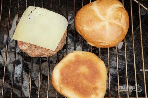 Чтобы булочки не промокали от соуса, их необходимо подсушить. Булочку разрезаем пополам, поверхность сбрызгиваем оливковым маслом и подсушиваем до корочки на гриле. На котлету кладем сыр Чеддер.