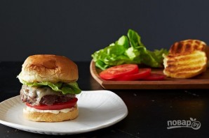 Помидор и листья салата промываем. Нарезаем помидор на ломтики и собираем бургер в любом порядке. Гамбургер дома готов.