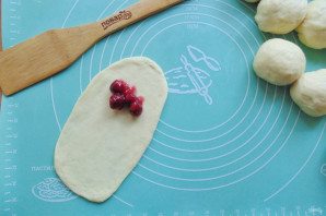 Раскатайте тесто в виде овала выложите начинку. У меня начинки немного с той лишь целью, чтобы она в процессе выпекания не вытекала из рогалика. Мне такого количества вишни достаточно. Вы можете класть больше.
