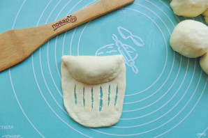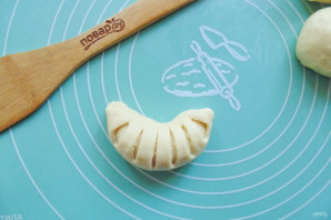 Накройте половинкой с прорезями и придайте форму рогалика.