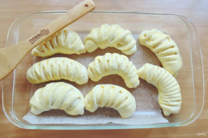 Форму для выпекания застелите пекарской бумагой. Выложите рогалики, дайте им немного подойти в течение 25-30 минут.