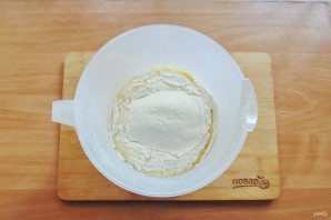 Постепенно просейте в ёмкость муку.