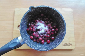 Пока тесто расстаивается, приготовьте начинку. В посуду с толстым дном выложите вишню. Влейте 100 грамм воды и добавьте сахар по вкусу. Поставьте на огонь и проварите 3-5 минут до полного растворения сахара.