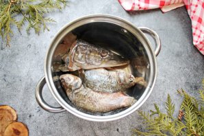 Річкову рибу, краще дрібну, очистіть від внутрішностей, видаліть зябра і ретельно промийте. У щуки відріжте голову, видаліть зябра і хвіст, решту наріжте шматочками. У каструлю покладіть річкову рибу, голову та хвіст (якщо є) щуки.