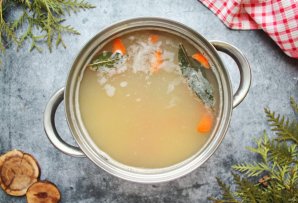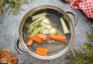 Поставте каструлю з рибою та овочами на середній вогонь і доведіть до кипіння. Зменшіть вогонь і варіть протягом 30 хвилин, зібравши піну. Зніміть каструлю з вогню, процедіть бульйон. Варену рибу та овочі нам більше не знадобляться.