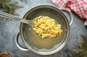 Пшоно переберіть, щоб видалити сміття, насипте в каструлю та залейте гарячою водою. Залиште пшоно на 15 хвилин, потім добре промийте та відкиньте на друшляк, щоб стекла вся вода.