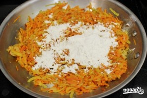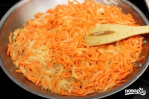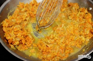 5. Очистіть і натріть на тертці моркву. Додайте на сковороду і смажте ще 5 хвилин, перемішуючи.