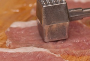 2. Після цього його можна трохи відбити. За правилами ескалоп не відбивають, але для м'якшості м'яса це все ж можна зробити.