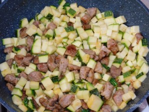 Добавьте кабачки, нарезанные кубиками и мелко нарезанный чеснок. Накройте крышкой и готовьте вместе минут 5-10. Чтобы кабачки стали мягче.
