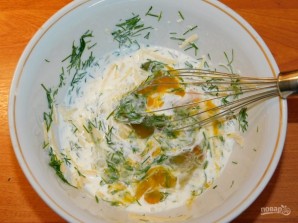 Отдельно смешайте яйца, сливки, специи. Добавьте тертый сыр и, мелко нарезанную, зелень. Перемешайте.