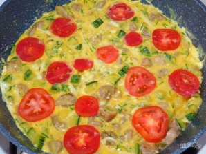 Залейте этой смесью мясо с кабачками. Разложите кружочки помидоров. Накройте крышкой и готовьте на маленьком огне до готовности. Примерно 10 минут.