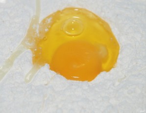 Просійте борошно в миску. До борошна додайте одне яйце та щіпку дрібної солі. Тісто потрібно добре вимісити, щоб повністю позбутися грудочок борошна. Спочатку вимішуйте тісто виделкою, а потім — руками.