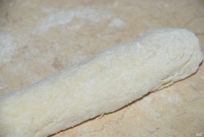 Натріть сир на великій тёрці, додайте його до тіста. Продовжуйте вимішувати його руками до однорідної консистенції. Потім посипте робочу поверхню борошном і скотіть із тіста колбаску діаметром близько 3-4 сантиметри.