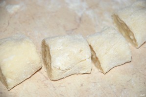 Якщо є час, то ковбаску можна покласти у холодильник на 30 хвилин. Потім цю ковбаску потрібно розрізати на однакові шматочки товщиною близько трьох сантиметрів. Отримані галушки трохи присипте борошном.