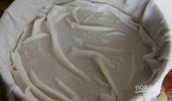 Один пласт выложите на основу в форму. Смажьте его маслом и выложите 1/3 сыра.