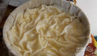 Большой кусок теста очень тонко раскатайте. Выложите его в жаропрочную форму. Смажьте пласт растопленным маслом.