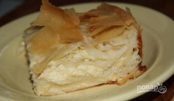 Выкладывайте остальные листы, смазывая их маслом. Сверху выложите не отваренное тесто.