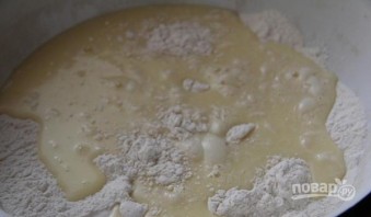 Просейте 1/3 муки. Добавьте к ней яичную смесь.