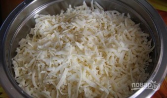 Для начинки натрите два вида сыра на тёрке.