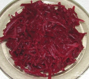 Буряк варимо до готовності 20-30 хвилин, очищаємо і тремо на великій тертці.
