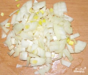 Дуже дрібно нарізаємо цибулю кубиками.