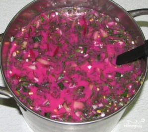 Усі нарізані інгредієнти викладаємо в каструлю з бурякою. Солимо за смаком і додаємо кефір. Перемішуємо.