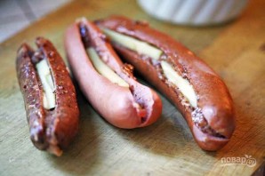1. Смешайте горчицу, кетчуп. В другой миске смешайте квашеную капусту, измельченный лук. Возьмите длинные сосиски и сделайте надрез от одного края до другого, но не прорезая полностью. Смажьте смесью горчицы и кетчупа, выложите внутрь тонкие ломтики сыра.