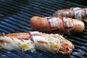 Вкусная закуска для любой компании. Особенность этого хот-дога в том, что сосиску для него начиняют, а затем заворачивают в бекон и обжаривают на гриле (можно в духовке или на сковороде). Вы можете добавить и остальные привычные ингредиенты, такие как: горчицу, кетчуп, майонез. Вы можете сделать разные начинки для сосиски, а есть такие хот-доги лучше сразу, пока они еще горячие